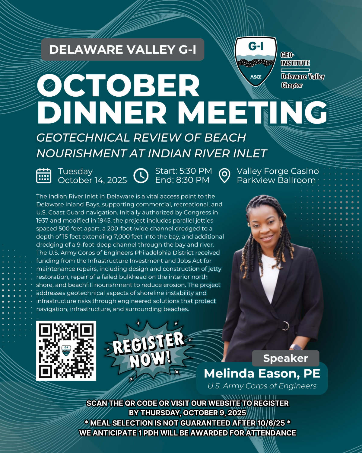 The Indian River Inlet in Delaware is a vital navigation link for the Inland Bays, supporting commercial, recreational, and Coast Guard use. Authorized by Congress in 1937, the project includes parallel jetties, a 200 ft wide channel dredged to 15 ft, and ongoing maintenance funded by the Infrastructure Investment and Jobs Act. This dinner meeting will feature Melinda Eason, Geotechnical Engineer with the U.S. Army Corps of Engineers Philadelphia District, discussing jetty restoration, shoreline stability, and infrastructure protection.